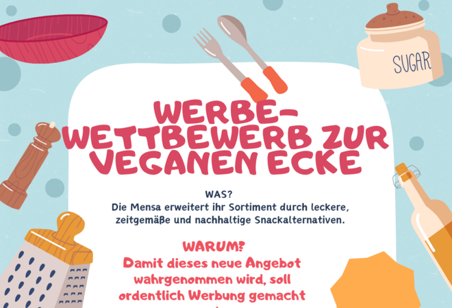 Liebe Schülerinnen und Schüler, ab Dezember 2025 wird es im Snackbereich der Mensa eine „Vegane Ecke“ geben. Damit dieses leckere und zeitgemäße Angebot möglichst gut bekannt gemacht wird, starten wir hierzu einen Wettbewerb! Schaut euch hier das Plakat zum Wettbewerb an! Vielleicht habt ihr ja Lust, mitzumachen!