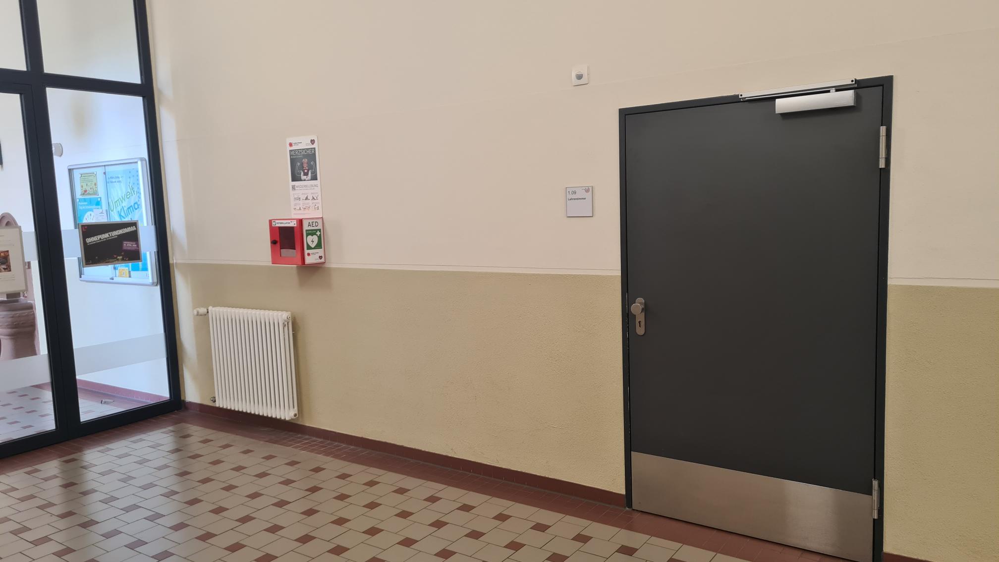 Seit dem Schuljahr 2025/2026 befindet sich im 1. OG zwischen Lehrerzimmer und Sekretariat ein Defibrillator.